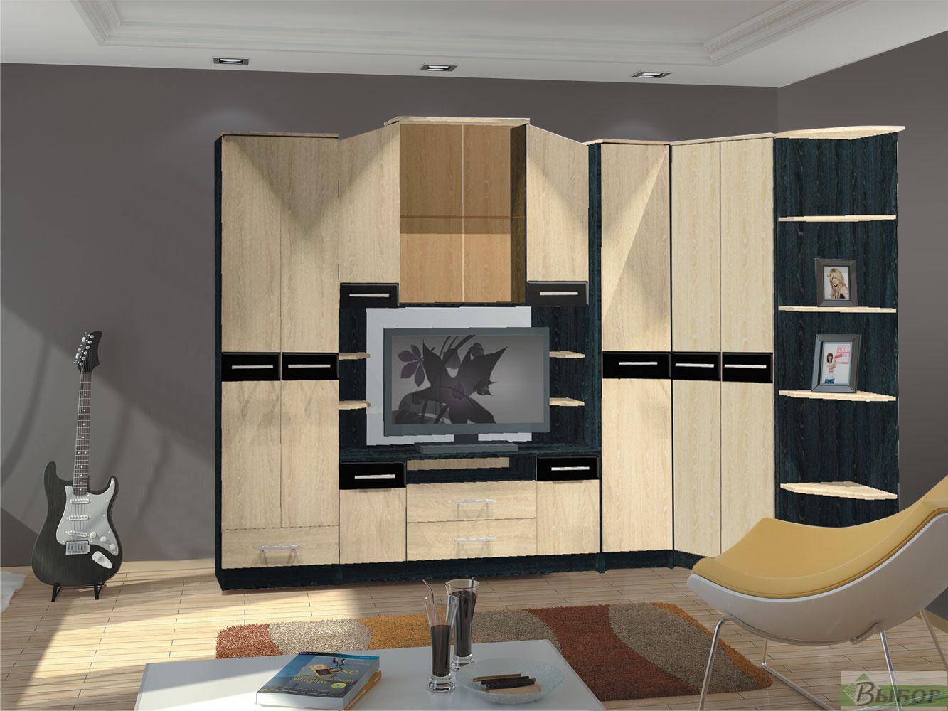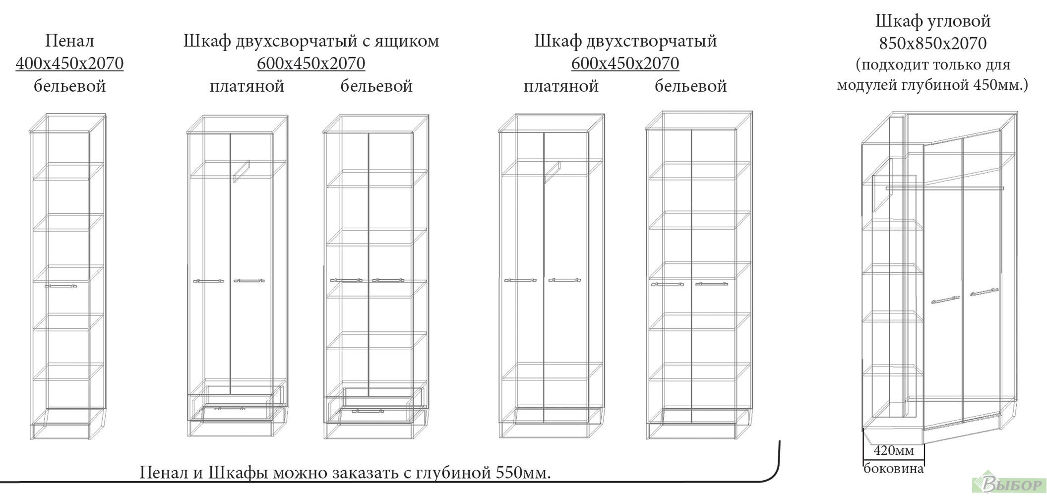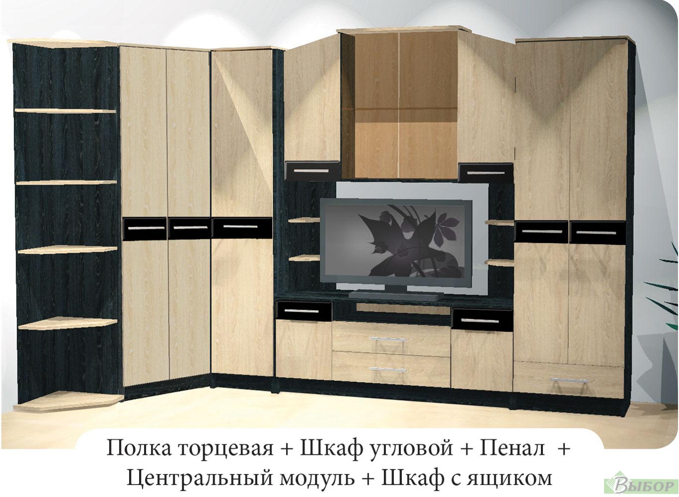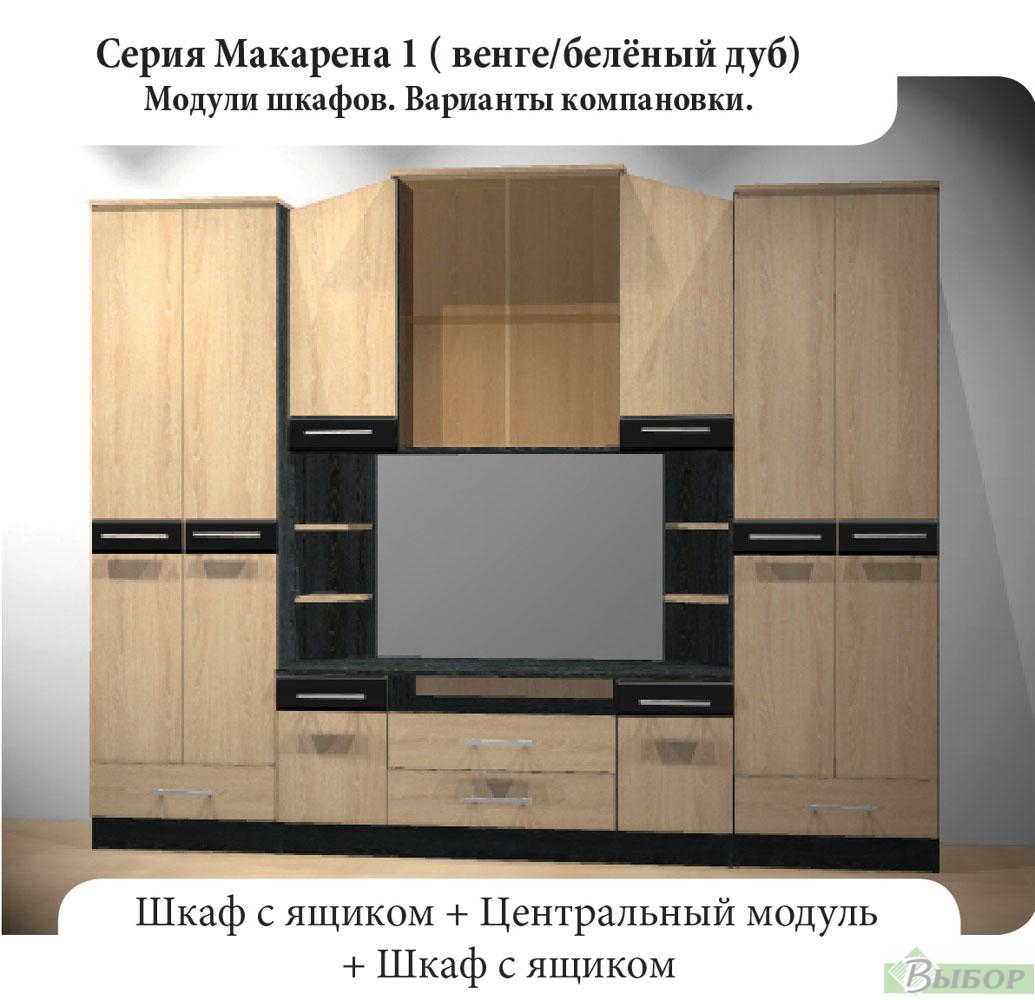 Варианты комплектовки: — при глубине шкафа 450мм используется выдвижная штанга — при глубине шкафа 550мм используется скалка В центральном модуле ниша под ТВ: с полками — 1370×670мм без полок — 970×670мм